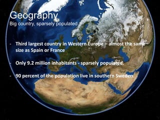 Sweden is a sparsely populated, third largest country in Western Europe with 9.2 million inhabitants. Over the past 100 years, Sweden transformed from a very poor country to a rich and well-educated nation with a highly skilled workforce. While Sweden had a violent ancient history, it has lived in peace since 1814 and avoided involvement in World Wars I and II. Sweden experienced an "economic miracle" in the 20th century by becoming one of the richest countries through exports of manufactured goods and high-tech solutions from companies like Volvo, IKEA, and Ericsson. Swedish society emphasizes security, well-being, and redistribution for all citizens through its welfare policies and strong environmental protections.