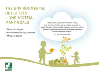 The generational goal is intended to guide environmental action at every level in society. It indicates the sorts of changes in society that need to occur within one generation to bring about a clean, healthy environment. It focuses environmental efforts on recovery of ecosystems, conserving biodiversity and the natural and cultural environment, good human health, efficient materials cycles free from dangerous substances, sustainable use of natural resources, efficient energy use, and patterns of consumption. You can read more about this goal at miljomal.se.