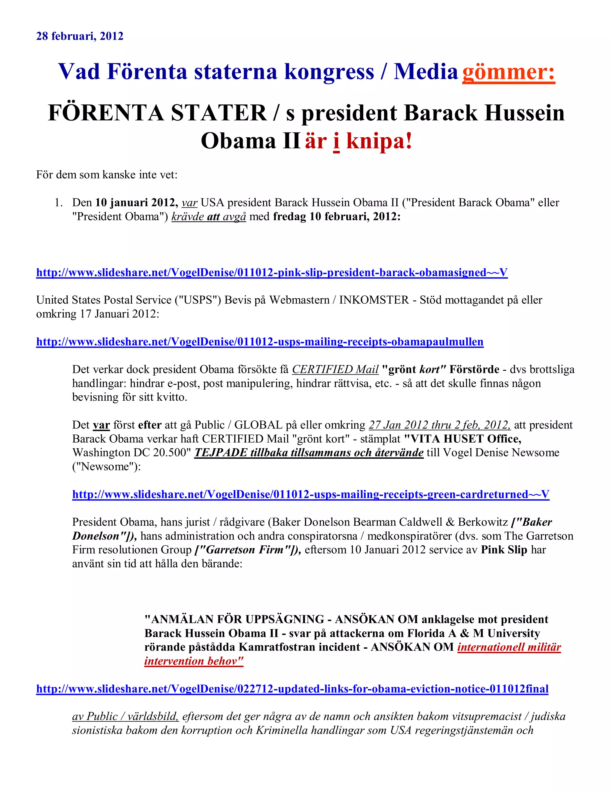 "ANMÄLAN FÖR UPPSÄGNING - ANSÖKAN OM anklagelse mot president Barack Hussein Obama