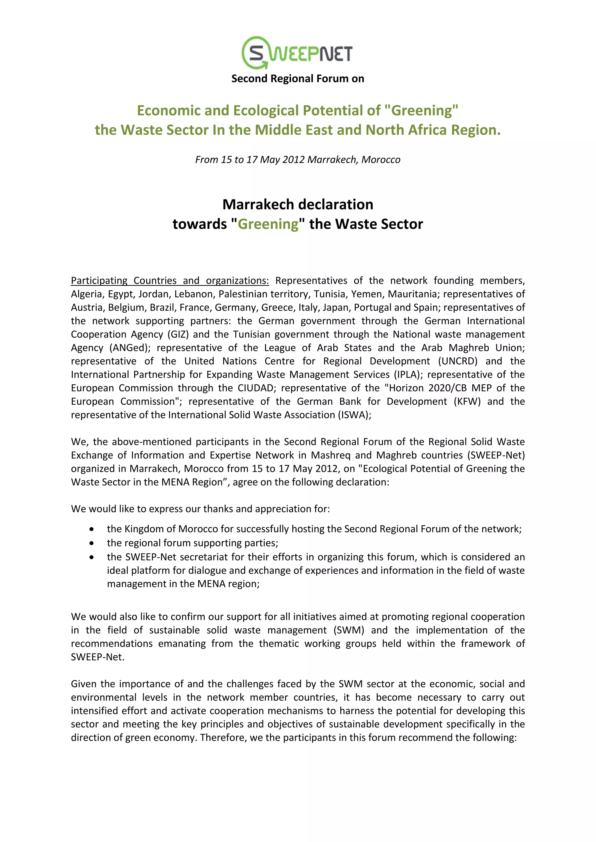 The document summarizes the recommendations from the Second Regional Forum on Economic and Ecological Potential of "Greening" the Waste Sector in the Middle East and North Africa Region, held from May 15-17, 2012 in Marrakech, Morocco. The forum brought together representatives from countries in the MENA region, international organizations, and other partners to discuss strengthening legal and institutional frameworks for sustainable solid waste management, developing financing mechanisms, adopting integrated technical approaches, raising public awareness, and promoting social inclusion and regional cooperation. The participants agreed to recommendations in these areas and committed to following up on the forum outcomes with decision-makers and stakeholders.
