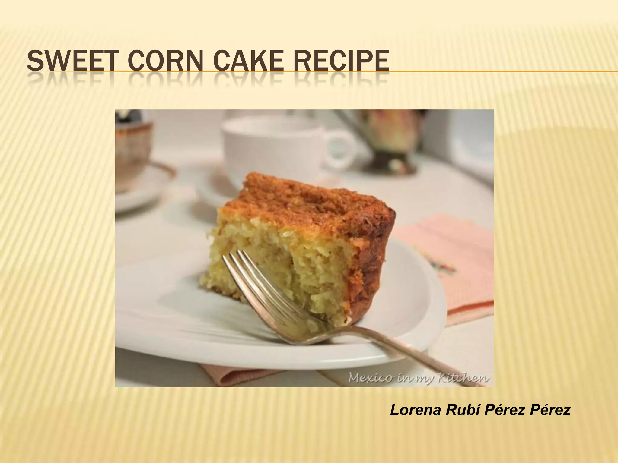 This recipe calls for sweet corn cake made with 6 ears of corn kernels blended and mixed into a batter with eggs, butter, sugar, flour and baking powder. The batter is poured into a baking pan and baked for 1 hour until a toothpick inserted in the center comes out clean. The finished cake will be golden brown and spring back when lightly touched.