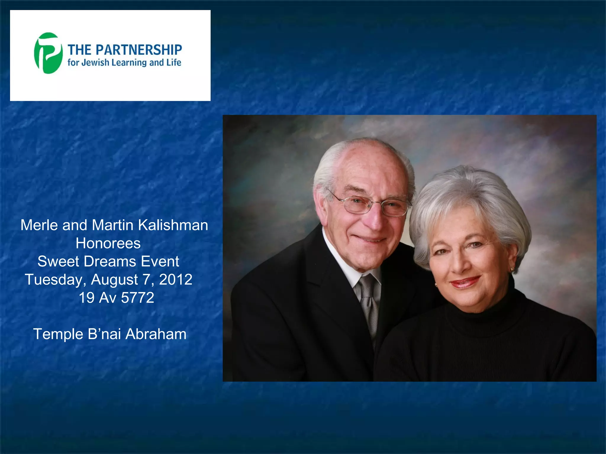 This document is a program for an event honoring Merle and Marty Kalishman. It contains messages from community members congratulating and thanking Merle and Marty for their commitment and contributions to the Jewish community through organizations like The Partnership for Jewish Learning and Life. The messages praise Merle and Marty's leadership, dedication, wisdom, and the positive impact they have had on the lives of many in the Greater MetroWest area.