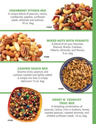 This document advertises and provides an order form for various snacks and candies being sold for $10 each. It includes descriptions and item numbers for 14 different snack mixes, trail mixes, nuts, and chocolates. The order form collects the customer's contact information and allows them to select items and total their order.