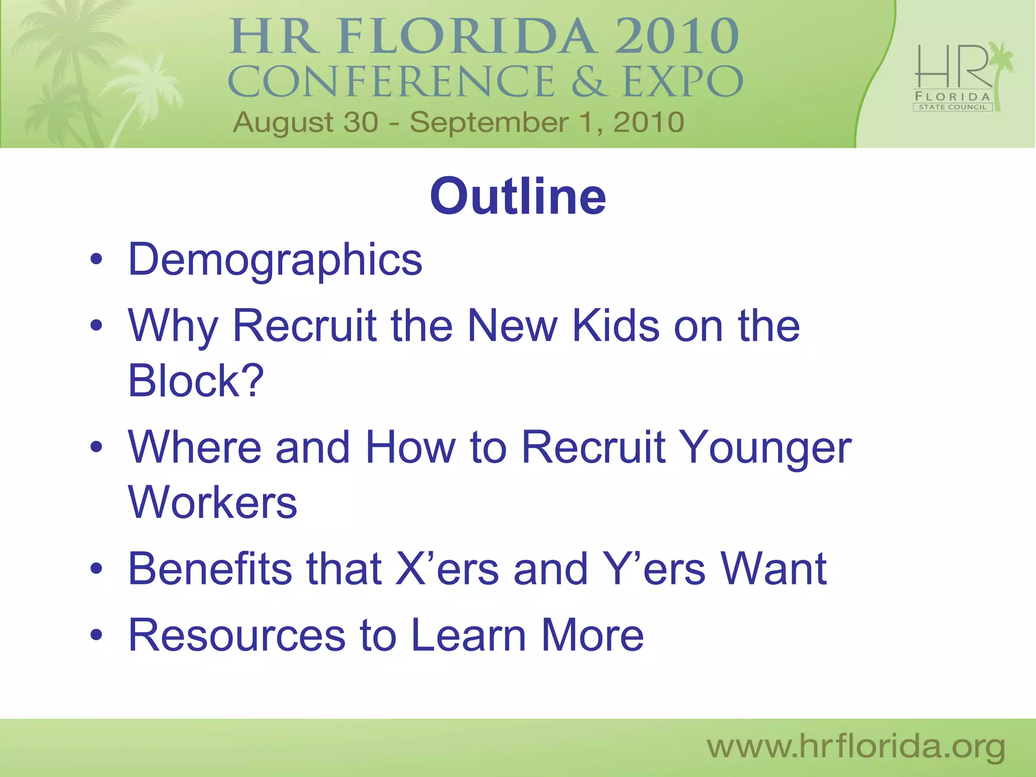 This document provides information and strategies for recruiting and retaining young talent, known as Generation X and Generation Y. It discusses the demographics of different generations currently in the workforce and why younger workers should be targeted. Recommendations are made for where and how to recruit these younger workers, including through company websites, colleges, social media, and referrals. Suggested benefits and work environments that appeal to Gen X and Y are also outlined, such as flexible hours, telecommuting, and work-life balance. The document concludes by emphasizing the importance of understanding younger generations for both employers and older workers.