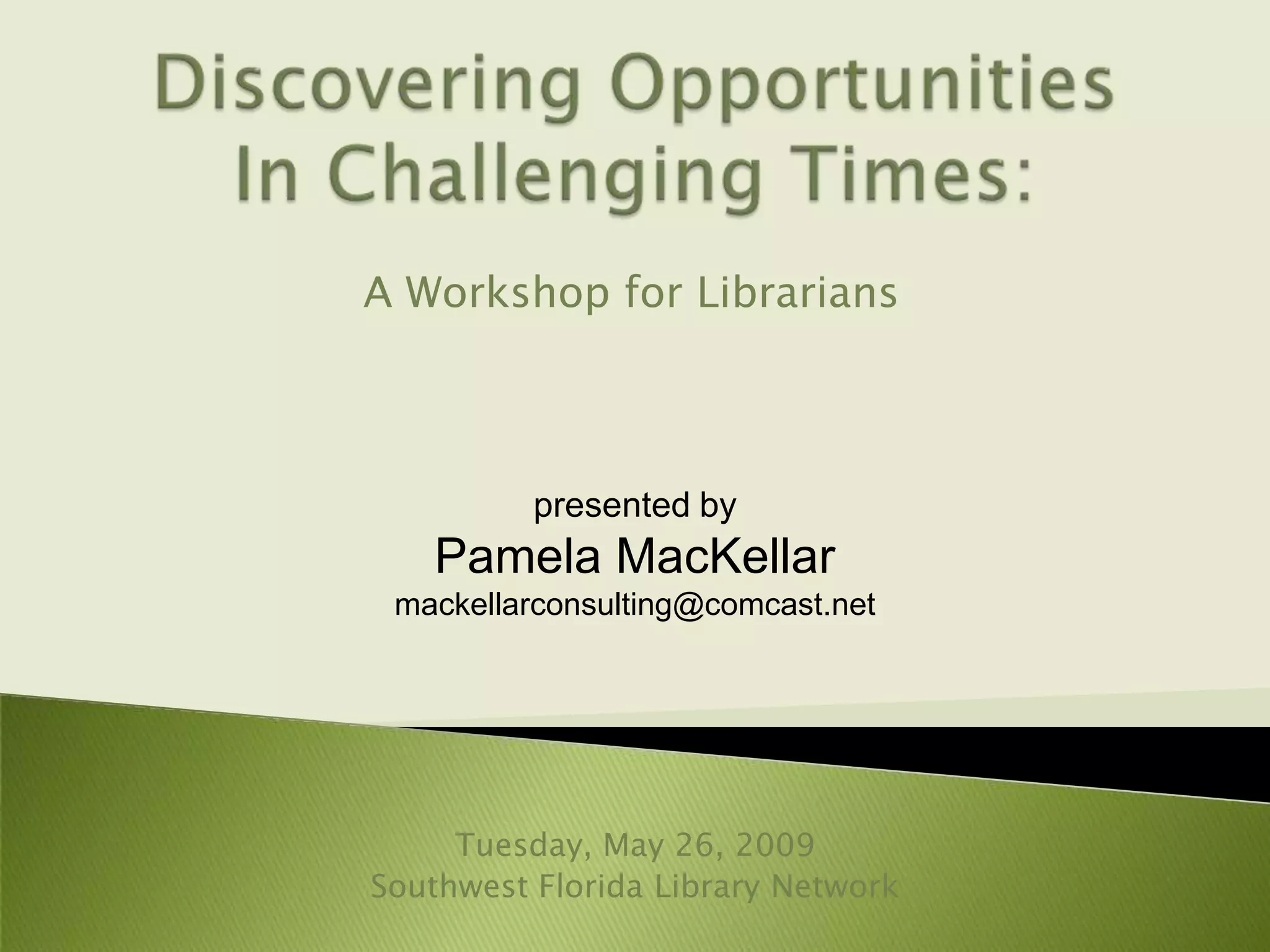 This document summarizes a workshop for librarians presented by Pamela MacKellar. The workshop aims to help librarians overcome obstacles and barriers in their work by adopting a more positive mindset. It provides tests and exercises for participants to evaluate their optimism levels and identify negative thought patterns. Techniques are presented for replacing negative thoughts with positive statements focusing on opportunities rather than limitations. The workshop also offers resources and ideas for librarians to enhance outreach, pursue funding opportunities, and implement creative programs in their communities.