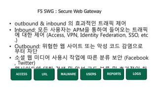 The document discusses Secure Web Gateway (SWG) technology which provides effective control of inbound and outbound network traffic. Key features of SWG include blocking access to dangerous websites or malware, classifying and securely filtering social media and web searches, and detecting malware in web pages. The document then focuses on the F5 SWG product and its primary capabilities such as URL/app filtering, malware detection, user identification, and security management/reporting. A comparison chart shows how F5's SWG compares favorably to other vendors in areas like advanced classification, real-time security, and content filtering.