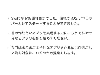 iOS デベロッ パーとしてスタートすることができました。 • 君の作りたいアプリを実現するのに、もうそれで十 分ならアプリを作り始めてください。 • 今回はまだまだ本格的なアプリを作るには自信がな い君を対象に、いくつかの提案をします。