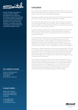 Swiitch Software developed a Video Coding Machine simulator for Australia Post to reduce training time and dropout rates. The simulator allows applicants to train at home and fully replicates the actual machine. It eliminated all dropouts and reduced training time by 10 days, saving Australia Post 80 hours per training session. Australia Post is distributing the simulator to over 100 applicants annually and is impressed by the impact on their business.