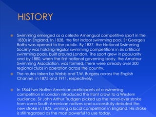 Swimming emerged as a competitive sport in England in the 1830s. By the 1880s, there were over 300 swimming clubs across the country. In 1844, Native Americans introduced the front crawl stroke to Western audiences. Sir John Arthur Trudgen popularized this stroke after learning it from South Americans in 1873. Swimming events have been held at the Summer Olympics since 1896, with competitions in butterfly, backstroke, breaststroke, and freestyle strokes. The international governing body for competitive swimming is FINA.