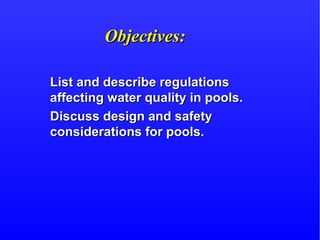 The document discusses regulations and guidelines for maintaining proper water quality in swimming pools. Standards recommend limits on microbial contaminants and requirements for pH, alkalinity, and clarity. Pool design considerations include providing different areas, ensuring proper depth for diving boards, and maintaining adequate surface area per bather. Safety is also addressed, such as eliminating diving boards in unsupervised areas and providing nonslip surfaces. Water treatment involves disinfection with chlorine, bromine, or UV, and controlling pH and mineral levels. Proper sampling techniques are described to periodically test water quality parameters.