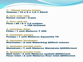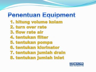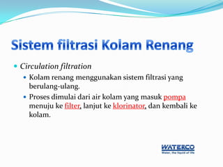 Dokumen ini membahas sistem filtrasi berulang pada kolam renang oleh PT Waterco Indonesia, mencakup proses dari masuknya air ke pompa hingga kembali ke kolam. Selain itu, dicantumkan daftar proyek yang menggunakan produk Waterco seperti apartemen, hotel, dan waterpark. Produk yang disebutkan termasuk filter, pompa, dan klorinator Waterco.