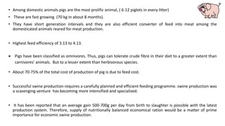 - Breeding pigs are fed lower protein (12%) to avoid fattening. Flushing increases ovulation for higher piglet production.