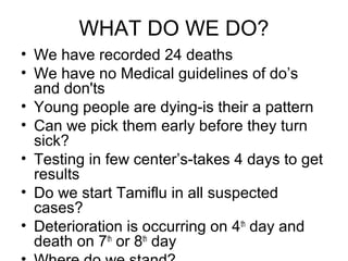 The document outlines the challenges faced in managing H1N1 influenza, including rapid deterioration of patients, need for timely testing, and the importance of recognizing symptoms for effective treatment. It emphasizes the clinical features, potential complications, and diagnostic criteria for H1N1, while also addressing prevention measures and the response to a pandemic. Key recommendations include testing at-risk individuals, proper isolation protocols, and the use of antiviral medications.