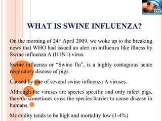 Swine influenza, also known as swine flu, is a respiratory disease in pigs caused by influenza viruses. In 2009, a new strain of H1N1 virus emerged that was able to infect humans. This outbreak led to the first influenza pandemic of the 21st century. The virus spreads from person to person through close contact and coughing or sneezing. Symptoms in humans include fever, cough, sore throat and body aches. Treatment involves antiviral drugs and supportive care. Public health measures aim to prevent and control the spread through social distancing, hand washing, isolation of infected individuals and vaccination.
