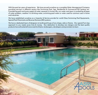 Aasri Pools provides complete water management services including swimming pool design, construction, and water treatment. They have over 10 years of experience and offer high quality equipment like filters, pumps, and covers. Their team can design and build pools of any shape or theme. They also provide spa equipment and water treatment solutions for drinking water, industrial uses, and more.