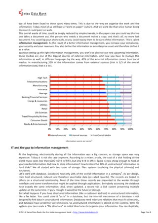 The document discusses the challenges of information management in the workplace, highlighting the common issue of workers using incorrect or improperly managed information, which leads to significant time and revenue loss. It shows how poor organization, reliance on outdated systems, and human error contribute to these problems. The author advocates for improved information management practices to enhance compliance, security, and overall efficiency within organizations.