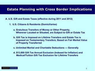 This document provides an overview of estate planning considerations for individuals with cross-border implications. It discusses U.S. gift and estate tax rules for U.S. citizens and residents as well as non-residents. It also covers generation-skipping transfer tax, pre-immigration planning, planning for permanent non-residents, and departure tax rules for expatriates. Special trusts and foreign holding entities are recommended for managing cross-border tax and asset protection issues.