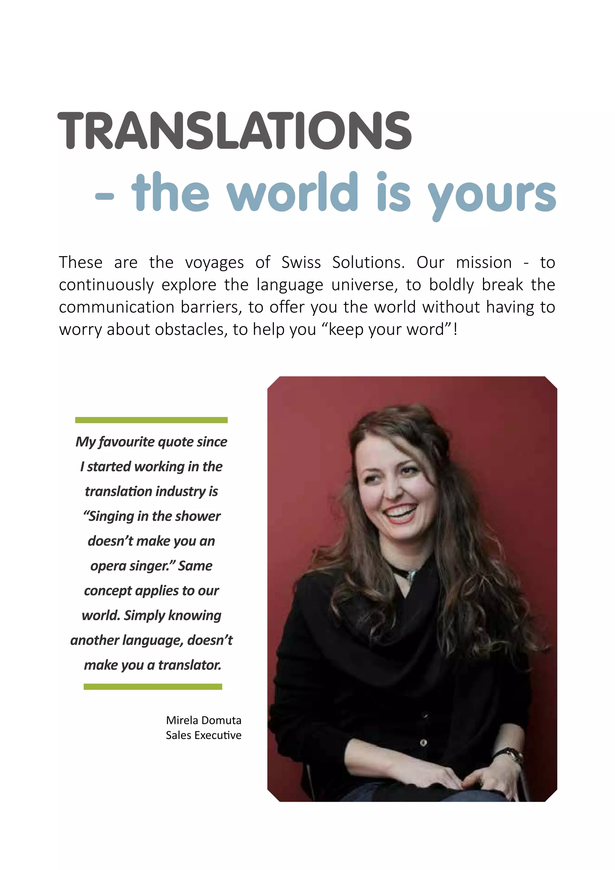 The document discusses language translation services provided by Swiss Solutions. It highlights that Swiss Solutions aims to help clients overcome language barriers to expand their global reach. It provides examples of translation projects Swiss Solutions has completed for automotive and renewable energy clients. These projects involved translating large volumes of technical documents and marketing materials into multiple languages within tight deadlines. Swiss Solutions was able to complete the projects more cost-effectively and quickly than other translation providers by leveraging its expertise, dedicated project managers, and translation tools.