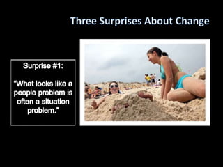 The document discusses strategies for facilitating change, emphasizing the importance of appealing to both emotional and logical aspects of decision-making. It outlines methods to motivate individuals by understanding their feelings, shaping their environment, and creating small, manageable steps toward change. Key concepts include directing rational thought (the rider) and influencing emotions (the elephant) to achieve lasting transformations.