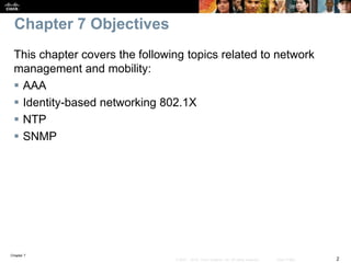 This chapter discusses network management topics including AAA (authentication, authorization, and accounting), 802.1X identity-based networking, NTP (Network Time Protocol), and SNMP (Simple Network Management Protocol). It provides details on configuring AAA using RADIUS and TACACS+ as well as 802.1X authentication. It also explains the need for accurate timekeeping via NTP and how to manually configure the system clock and implement daylight saving time adjustments.