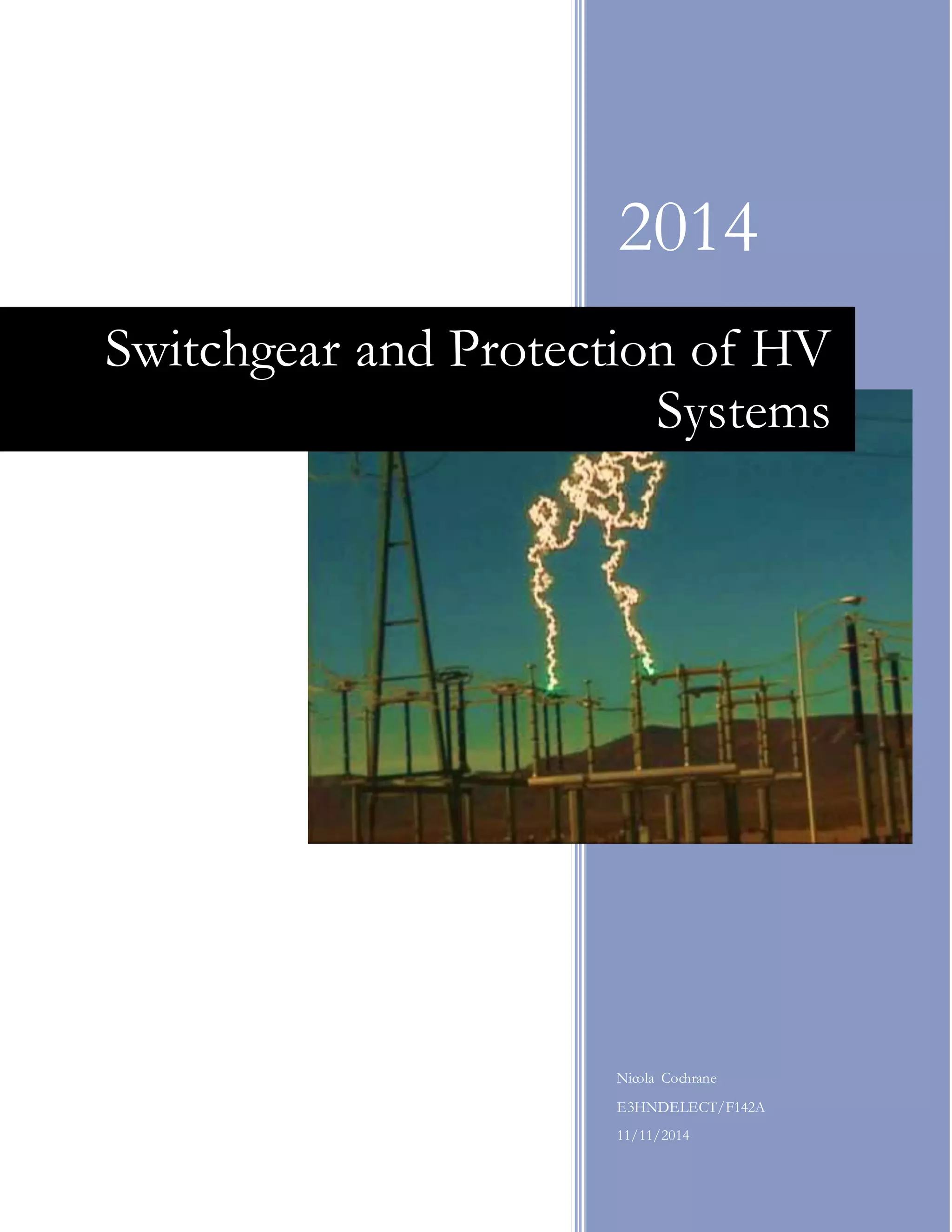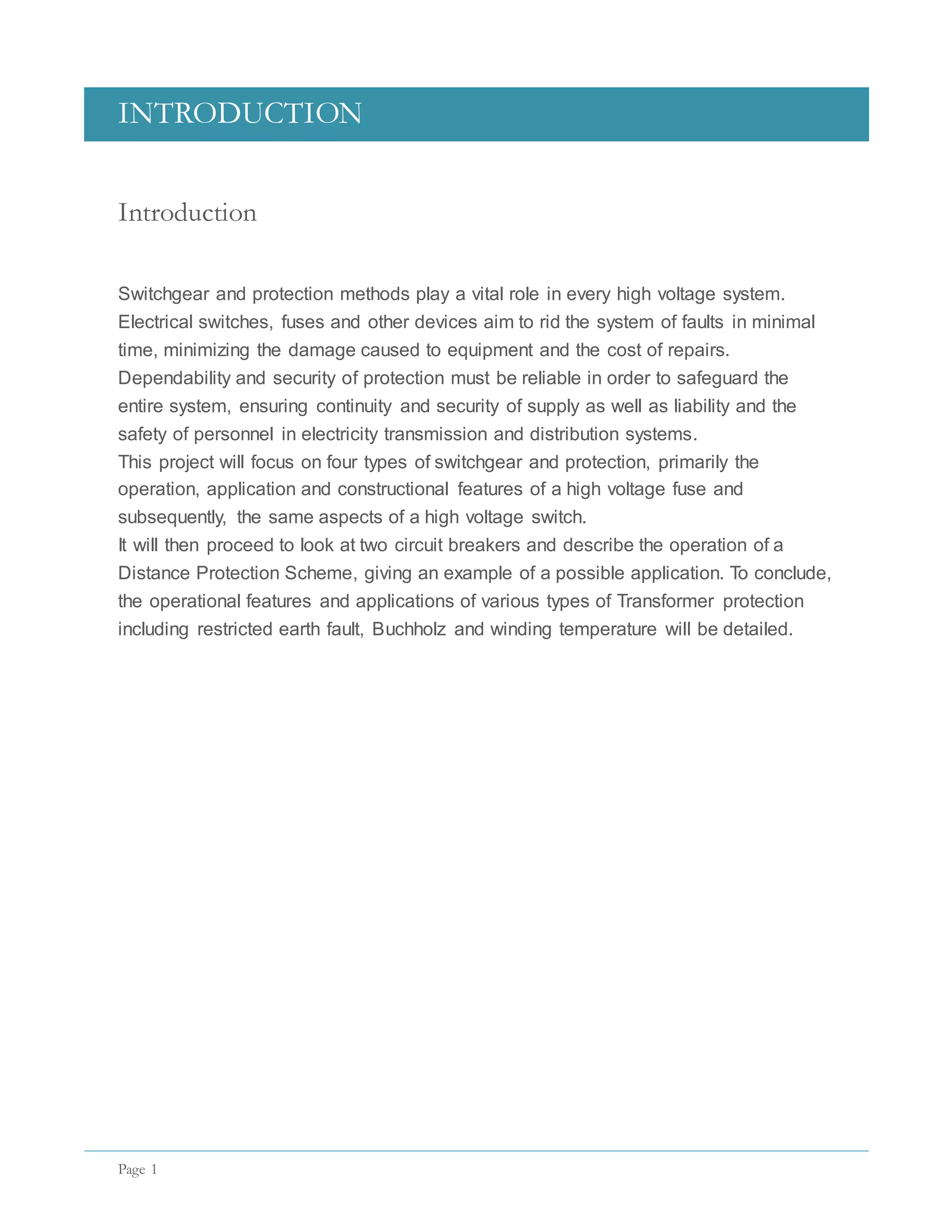 This document provides an overview of various types of switchgear and protection methods used in high voltage electrical systems. It describes the construction, operation, and applications of high voltage fuses, switches, sulfur hexafluoride and vacuum circuit breakers. It also discusses distance protection schemes such as translay feeder protection and transformer protection methods including restricted earth fault, Buchholz, and winding temperature protection. The document contains diagrams to illustrate the components and operation of the different switchgear and protection devices.