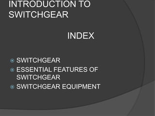 This presentation provides an introduction to switchgear. It defines switchgear as equipment used for switching, controlling, and protecting electrical circuits and equipment, consisting of devices like switches, fuses, circuit breakers, and relays. Essential features of switchgear include reliability, discrimination between faulty and healthy sections, quick operation, and provisions for manual and instrument control. Common types of switchgear equipment discussed are switches, fuses, circuit breakers, and relays.