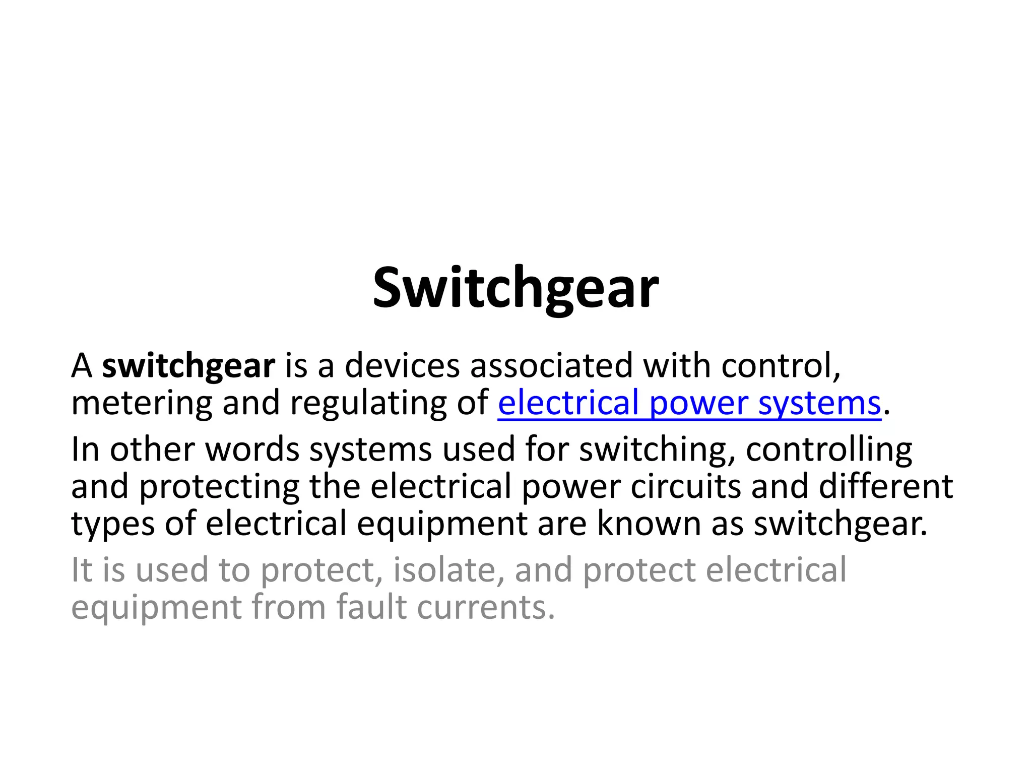 Switchgear is electrical equipment used to control, protect, and isolate electrical systems. It includes components like fuses, switches, relays, and circuit breakers. There are three main types - low voltage, medium voltage, and high voltage. Circuit breakers use various mediums like air, sulfur hexafluoride gas, or oil to detect faults and quickly interrupt current to isolate issues and protect equipment. SF6 gas is commonly used due to its excellent insulating and arc quenching properties. Air blast circuit breakers use compressed air to extinguish arcs by forcing high velocity air jets onto the arc through nozzles.