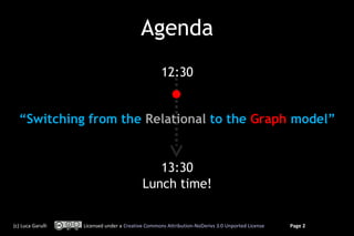 The document discusses switching from a relational database model to a graph database model. It provides an overview of graph databases, including how they represent relationships through edges and vertices, support properties on both, and can model one-to-one, one-to-many, and many-to-many relationships without additional tables. It also notes that graph databases provide index-free adjacency, avoiding the performance issues of JOIN operations in relational databases for traversing relationships.