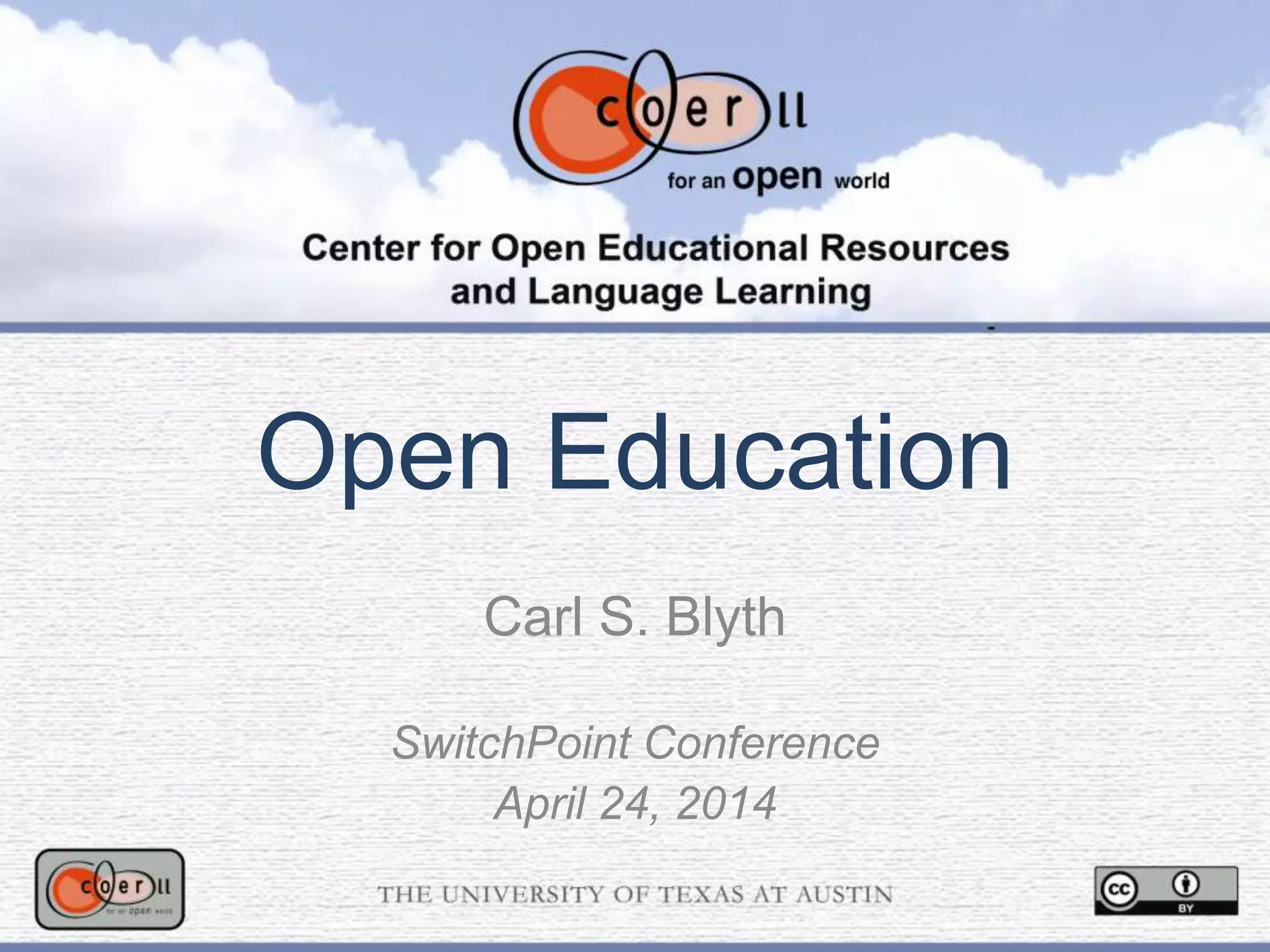 This document discusses open education and open educational resources (OER). It defines open education as forms of education where knowledge and teaching methods are freely shared online. The open education movement is based on sharing knowledge freely and enabling collaboration. OER include textbooks, courseware, activities, and media that can be reused, redistributed, revised, and remixed under open licenses like Creative Commons. Using OER lowers costs, increases access, and allows for adaptable, learner-designed materials through community sharing. The conclusion states that sharing is the basic characteristic of education.