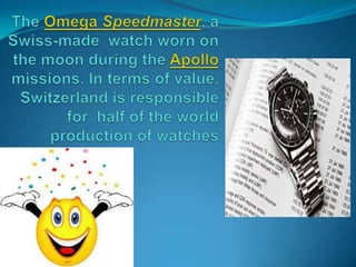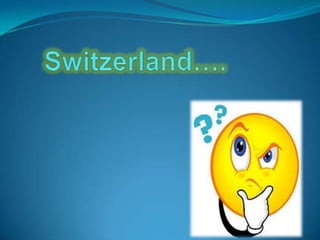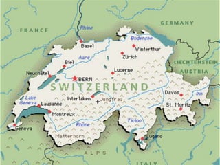 Switzerland is a federal republic located in Western and Central Europe. It has four national languages - German, French, Italian, and Romansh. Switzerland has 26 cantons and a population of around 7.8 million people. Some of Switzerland's most notable cultural events include the Lucerne Festival, Montreux Jazz Festival, and Locarno International Film Festival. Switzerland does not have an official state religion, but most cantons recognize either the Catholic Church or Swiss Reformed Church. Swiss cuisine features dishes like fondue, raclette, and rösti that vary across regions.