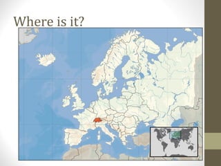 Switzerland is located in Central Europe. The Swiss Franc is the currency and the climate in spring has daytime temperatures between 8-15 degrees Celsius. Hiking is a popular tourist activity in the Swiss Alps, with over 22,000 miles of well-maintained trails passing through mountains. The town of Interlaken is located between two lakes and is a popular destination for hiking and skiing, offering views of the Jungfrau mountain.