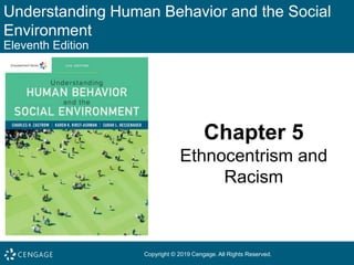 Chapter 5 of 'Understanding Human Behavior and the Social Environment' explores ethnocentrism, racism, and the implications of discrimination and oppression on society. It outlines the definitions of key concepts, sources of prejudice, and strategies for social and economic justice while emphasizing the role of social work in addressing these issues. The chapter also predicts future race and ethnic relations in the U.S., highlighting the assertive pursuits of minority groups for change.