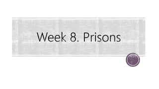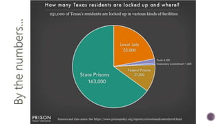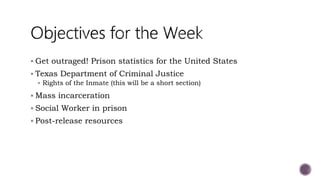 This document summarizes information about the US federal prison system and the Texas Department of Criminal Justice. It outlines the growth of prisoner populations in both systems from the 1980s onward due to tougher sentencing laws. It also describes the different security levels in federal prisons and some of the key events and reforms in the history of the Texas prison system. Finally, it summarizes some of the legal rights that inmates have under Texas law.