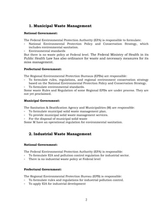 The document summarizes the general municipal solid waste management system in Ethiopia. It discusses the responsibilities of different levels of government for waste management and identifies issues and problems. The national government is responsible for policy and standards while regional and municipal governments implement plans. There is no uniform system and waste is often improperly disposed of. The document then analyzes waste generation sources, collection and transportation challenges, lack of treatment, and need for improved education and awareness.