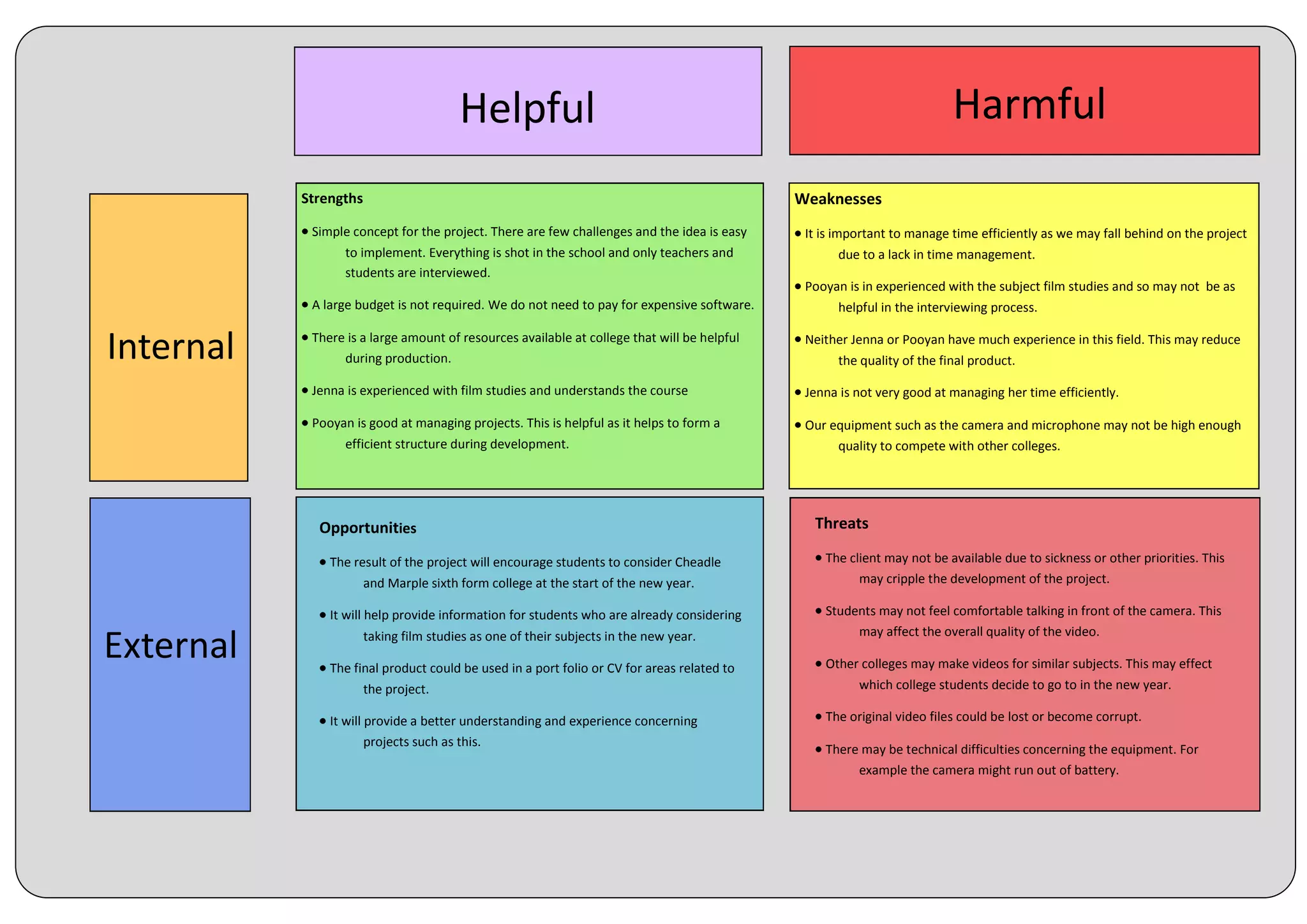 This document analyzes the strengths, weaknesses, opportunities, and threats for a student film project. It notes that the project has a simple concept and requires few resources. However, the students have little experience in film studies, which could reduce the quality of the final product. It also identifies efficient time management and high quality equipment as challenges. Opportunities include encouraging student enrollment and experience for future work. Threats involve client availability, technical difficulties, and competition from other colleges.