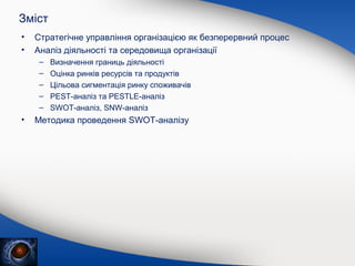 Аналіз діяльності та середовища організації: визначення границь діяльност; оцінка ринків ресурсів та продуктів; цільова сигментація ринку споживачів; PEST-аналіз та PESTLE-аналіз; SWOT-аналіз, SNW-аналіз.