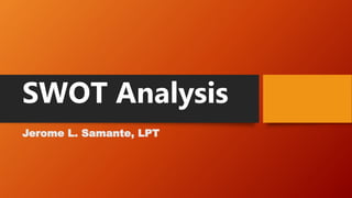 SWOT analysis is a technique that examines an organization's strengths, weaknesses, opportunities, and threats. It helps identify goals and strategies by analyzing an organization's internal and external factors. The framework involves analyzing strengths, weaknesses, opportunities, and threats. Strengths and weaknesses are internal to the organization, while opportunities and threats relate to external factors. Conducting a SWOT analysis is useful for businesses, marketers, and entrepreneurs to strategize effectively.
