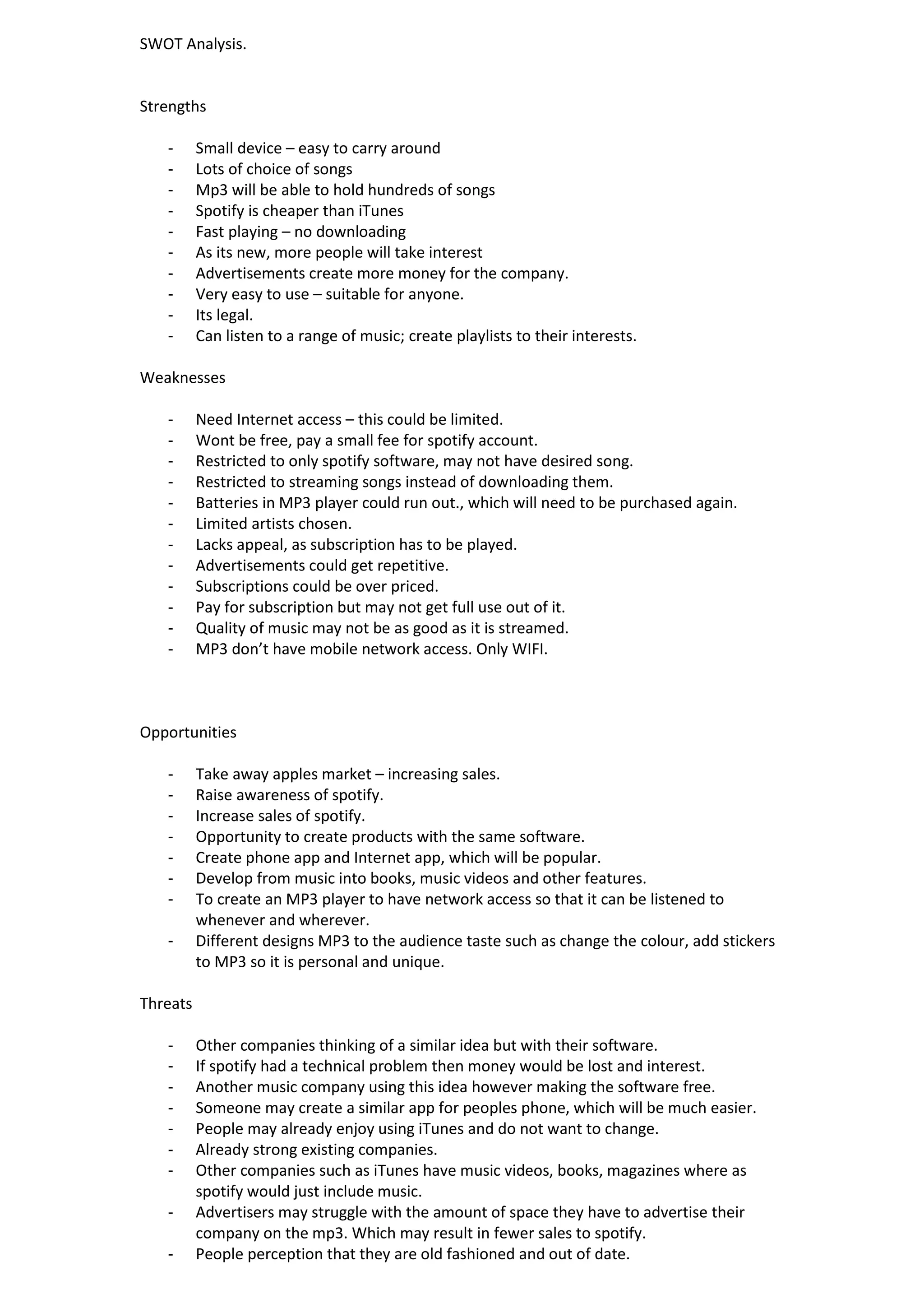 Spotify offers several strengths as a music streaming service including its small, portable device size, large music library and cheaper price than iTunes. However, it also has weaknesses such as relying on internet access and being restricted to the Spotify software and streaming only. There are opportunities for Spotify to take market share from Apple and expand its product offerings. But threats include competition from other music companies and platforms, technical problems reducing interest, and advertisers struggling with limited space.