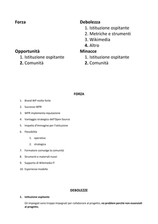 La SWOT analysis del progetto Nissapedia evidenzia punti di forza come il forte brand di Wikipedia e il supporto di Wikimedia, mentre le debolezze includono la mancanza di supporto uniforme da parte dell'istituzione ospitante e delle sfide nel coinvolgimento del personale. Le opportunità si presentano attraverso l'uso crescente del web da parte delle istituzioni culturali e la potenziale creazione di risorse significative, ma ci sono anche minacce legate all'affidabilità del supporto della comunità. In generale, il successo del progetto richiede una chiara definizione degli obiettivi e un attivo coinvolgimento di tutte le parti interessate.