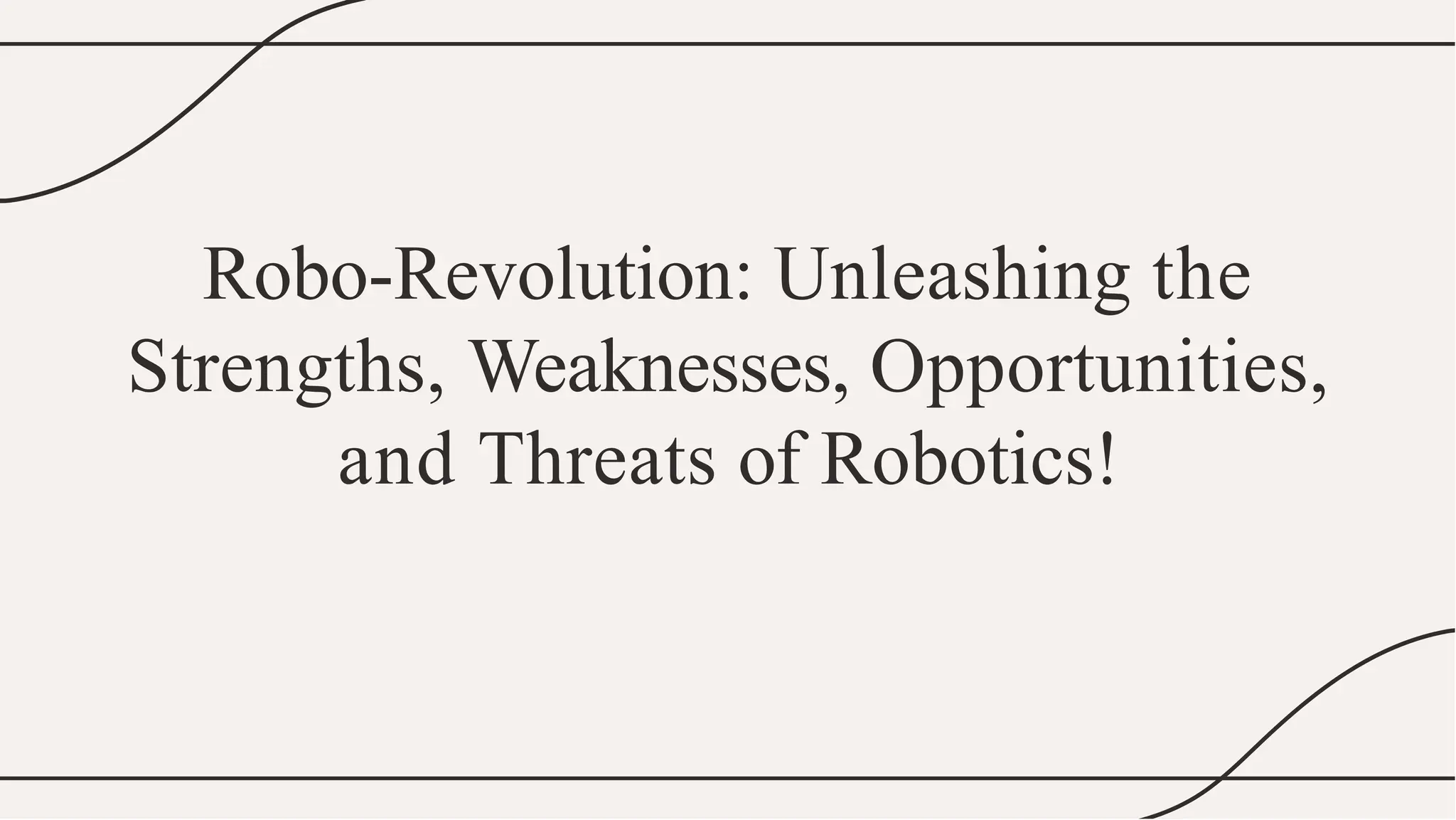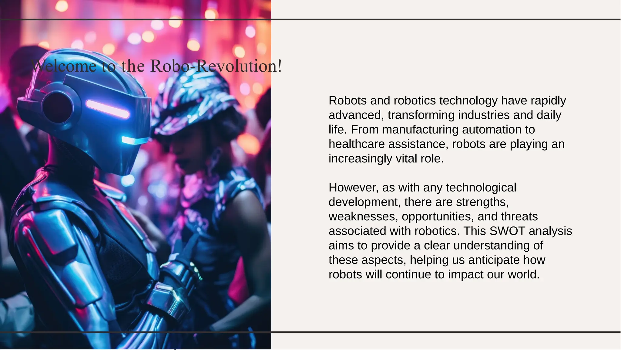 The document discusses the rapid advancement of robotics across various industries, highlighting its strengths, weaknesses, opportunities, and threats (SWOT). It emphasizes robotics' potential to enhance efficiency, productivity, and innovation while acknowledging challenges like job displacement and ethical concerns. The future of robotics is poised for transformation in healthcare, education, and the creation of new economies, necessitating responsible development and ethical considerations.