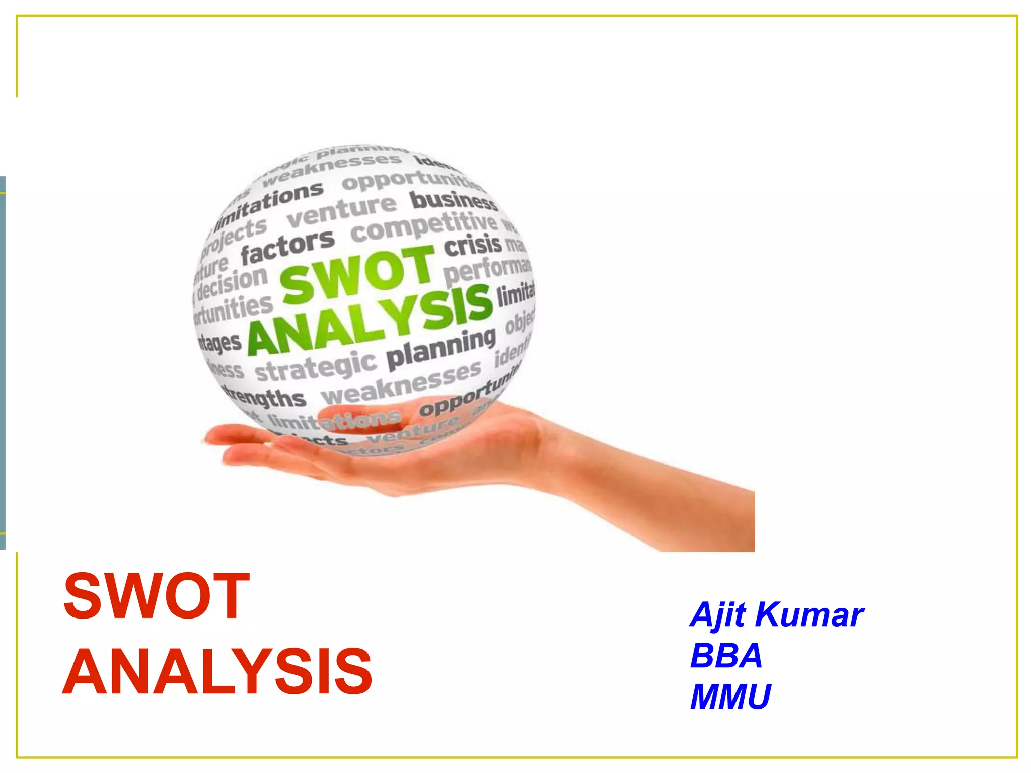 SWOT analysis is a technique used to evaluate the strengths, weaknesses, opportunities, and threats involved in a project or business venture. It involves specifying the objective of the business venture or project and identifying the internal and external factors that are favorable and unfavorable to achieving that objective. The analysis framework allows individuals and groups to identify ways to improve performance by building on strengths, reducing weaknesses, exploiting opportunities, and defending against threats. The goal of SWOT analysis is to help decision makers develop a full awareness of all the factors involved in a decision.