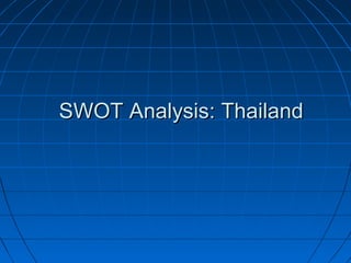 Thailand has strengths in agriculture, tourism, and skilled labor. However, weaknesses include a lack of access to capital, low brand ownership among SMEs, and a lack of entrepreneurship. Opportunities exist in expanding to larger ASEAN markets due to Thailand's strategic location and reputation. Threats include high production costs, cheaper imports, and a lack of national integration among government agencies.
