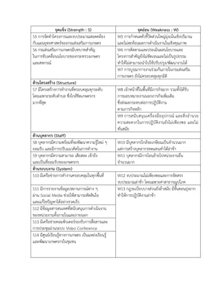 S) จุดอ่อน (Weakness : W) S5 การจัดทาโครงการและงบประมาณสอดคล้อง กับแผนยุทธศาสตร์ของกรมส่งเสริมการเกษตร W5 การกาหนดตัวชี้วัดส่วนใหญ่มุ่งเน้นเชิงปริมาณ และไม่สะท้อนผลการดาเนินงานในเชิงคุณภาพ S6 กรมส่งเสริมการเกษตรมีบทบาทสาคัญ ในการขับเคลื่อนนโยบายของกระทรวงเกษตร และสหกรณ์ W6 การติดตามและประเมินผลนโยบายและ โครงการสาคัญยังไม่ชัดเจนและไม่เป็นรูปธรรม ทาให้ไม่สามารถนาไปใช้ปรับปรุง/พัฒนางานได้ W7 การบูรณาการงานร่วมกันภายในกรมส่งเสริม การเกษตร ยังไม่ครอบคลุมทุกมิติ ด้านโครงสร้าง (Structure) S7 มีโครงสร้างการทางานที่ครอบคลุมทุกระดับ โดยเฉพาะระดับตาบล ซึ่งใกล้ชิดเกษตรกร มากที่สุด W8 เจ้าหน้าที่ในพื้นที่มีภารกิจมาก รวมทั้งได้รับ การมอบหมายงานนอกภารกิจเพิ่มเติม ซึ่งส่งผลกระทบต่อการปฏิบัติงาน ตามภารกิจหลัก W9 การสนับสนุนเครื่องมืออุปกรณ์ และสิ่งอานวย ความสะดวกในการปฏิบัติงานยังไม่เพียงพอ และไม่ ทันสมัย ด้านบุคลากร (Staff) S8 บุคลากรมีความพร้อมที่จะพัฒนาความรู้ใหม่ ๆ ยอมรับ และมีการปรับแนวคิดในการทางาน W10 มีบุคลากรใกล้จะเกษียณเป็นจานวนมาก แต่การสร้างบุคลากรทดแทนทาได้ล่าช้า S9 บุคลากรมีความสามารถ เสียสละ เข้าถึง และเป็นที่ยอมรับของเกษตรกร W11 บุคลากรมีการโอนย้ายไปหน่วยงานอื่น จานวนมาก ด้านระบบงาน (System) S10 มีเครือข่ายการทางานครอบคลุมในทุกพื้นที่ W12 งบประมาณไม่เพียงพอและการจัดสรร งบประมาณล่าช้า โดยเฉพาะค่าสาธารณูปโภค S11 มีการรายงานข้อมูล/สถานการณ์ต่าง ๆ ผ่าน Social Media ช่วยให้สามารถตัดสินใจ และแก้ไขปัญหาได้อย่างรวดเร็ว W13 กฎระเบียบบางส่วนยังล้าสมัย มีขั้นตอนยุ่งยาก ทาให้การปฏิบัติงานล่าช้า S12 มีข้อมูลสารสนเทศที่สนับสนุนการดาเนินงาน ของหน่วยงานทั้งภายในและภายนอก S13 มีเครือข่ายคอมพิวเตอร์รองรับการสื่อสารและ การประชุมผ่านระบบ Video Conference S14 มีศูนย์เรียนรู้ทางการเกษตร เป็นแหล่งเรียนรู้ และพัฒนาเกษตรกรในชุมชน