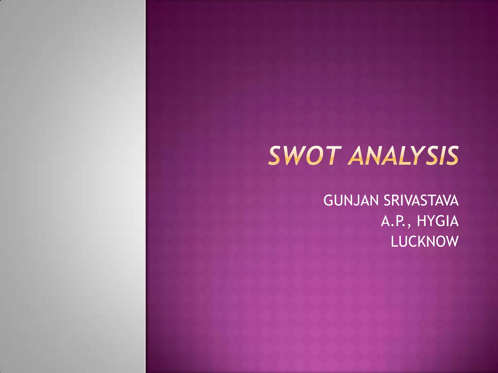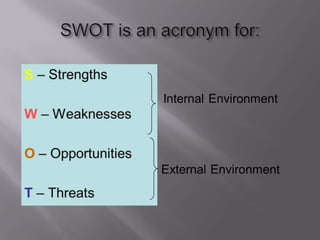 This document provides an overview of SWOT analysis, including its definition, purpose, and how to conduct one. SWOT analysis is a technique used to assess an organization's strengths, weaknesses, opportunities, and threats. It involves analyzing internal factors (strengths and weaknesses) as well as external factors (opportunities and threats). The document outlines each component of a SWOT analysis and provides tips for effective analysis, such as being analytical and specific, choosing the right participants, and using the results to inform planning.