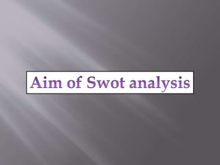 This document provides an overview of SWOT analysis, including its definition, purpose, and how to conduct one. SWOT stands for strengths, weaknesses, opportunities, and threats. It is a framework used to evaluate a project, business venture, person, or organization and develop strategic planning. The key aspects covered include defining the four components of a SWOT analysis, who could benefit from conducting one, the basic steps to perform an analysis, potential pitfalls, and tips for effective usage.