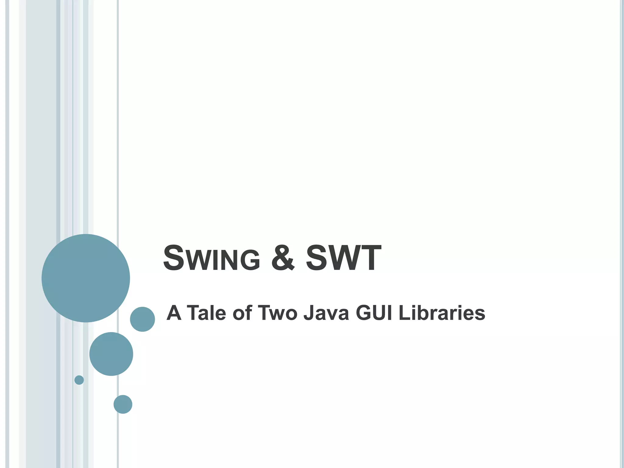 This document compares the three main Java GUI libraries: AWT, Swing, and SWT. AWT is the oldest toolkit but relies on native GUI elements, resulting in platform dependence. Swing was developed to address AWT's limitations like platform dependence and uses Java2D for rendering instead of native code, but components are slower. SWT tries to combine the advantages of AWT and Swing by using native components through JNI but is not part of the Java standard API. There is an ongoing debate between Java developers about whether Swing or SWT is a better choice for GUI development.