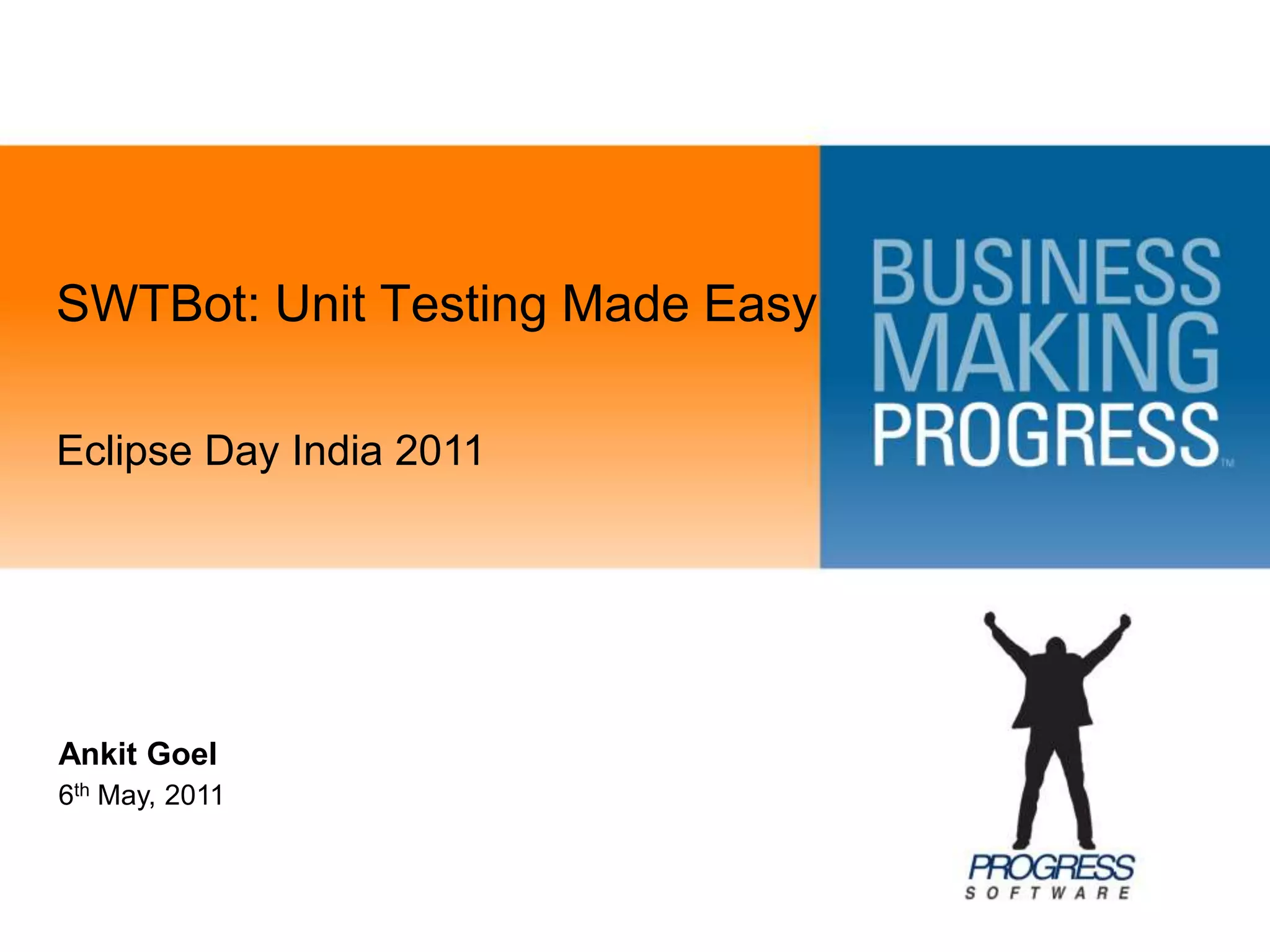 SWTBot is a Java-based UI testing tool for SWT and Eclipse applications that simplifies unit testing by providing an intuitive API for widget manipulation. It supports finding controls, simulating user input, querying widget states, and integrating with continuous build systems for automated testing. While it covers many SWT controls, it has limitations, including some unsupported widgets and a lack of documentation.
