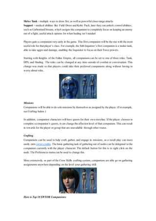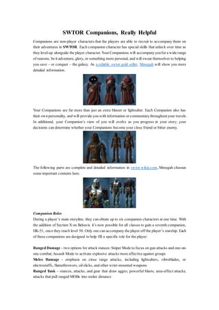 In SWTOR, companions are non-playable characters that players can recruit to assist them on their adventures, each possessing unique abilities that develop over time. Players can have multiple companions that serve specific roles, such as tank, ranged damage, and support, which can be customized based on player preferences. Companions also have their own storylines and can engage in crafting or gathering missions to aid players in earning credits.