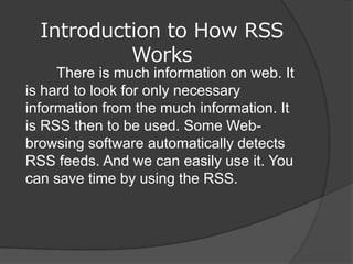 RSS is Really Simple Syndication, a way to subscribe to regularly updated content like websites and receive summaries of new information. RSS uses XML formats to deliver headlines and summaries to the user through an RSS reader, allowing them to efficiently keep up with multiple sources in one place rather than visiting each site individually. RSS feeds are simple text files that follow Resource Description Framework guidelines to indicate to aggregators how to retrieve and display the updates. Many blogging platforms and tools make it easy to generate RSS feeds without requiring technical coding skills.