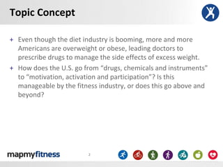 The document discusses how fitness and healthcare industries can work together to encourage physical activity and healthy eating over prescribing drugs to treat obesity and related conditions. It notes that gamification of fitness apps and wearable sensors that track health data make exercise and diet monitoring easier. However, these technologies may not be enough to reverse obesity trends on their own. The document argues that fitness companies should work with doctors to prescribe exercise and nutrition instead of pharmaceuticals. Speakers from MapMyFITNESS will discuss these issues and how to motivate cities and states to encourage their constituents to become more active.